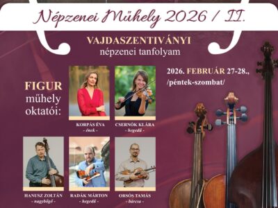 Helyszín: Zichy Pont, Komárom Időpont: 2026. február 27-28. FIGUR ZENE szakmai koordinálásával népzenei összjáték kurzust hirdetnek. Jelentkezni kezdő ifjúsági és felnőtt zenekaroknak lehet egy zenekari számmal (lehetőleg autentikus népzenével), melyet... Bővebben